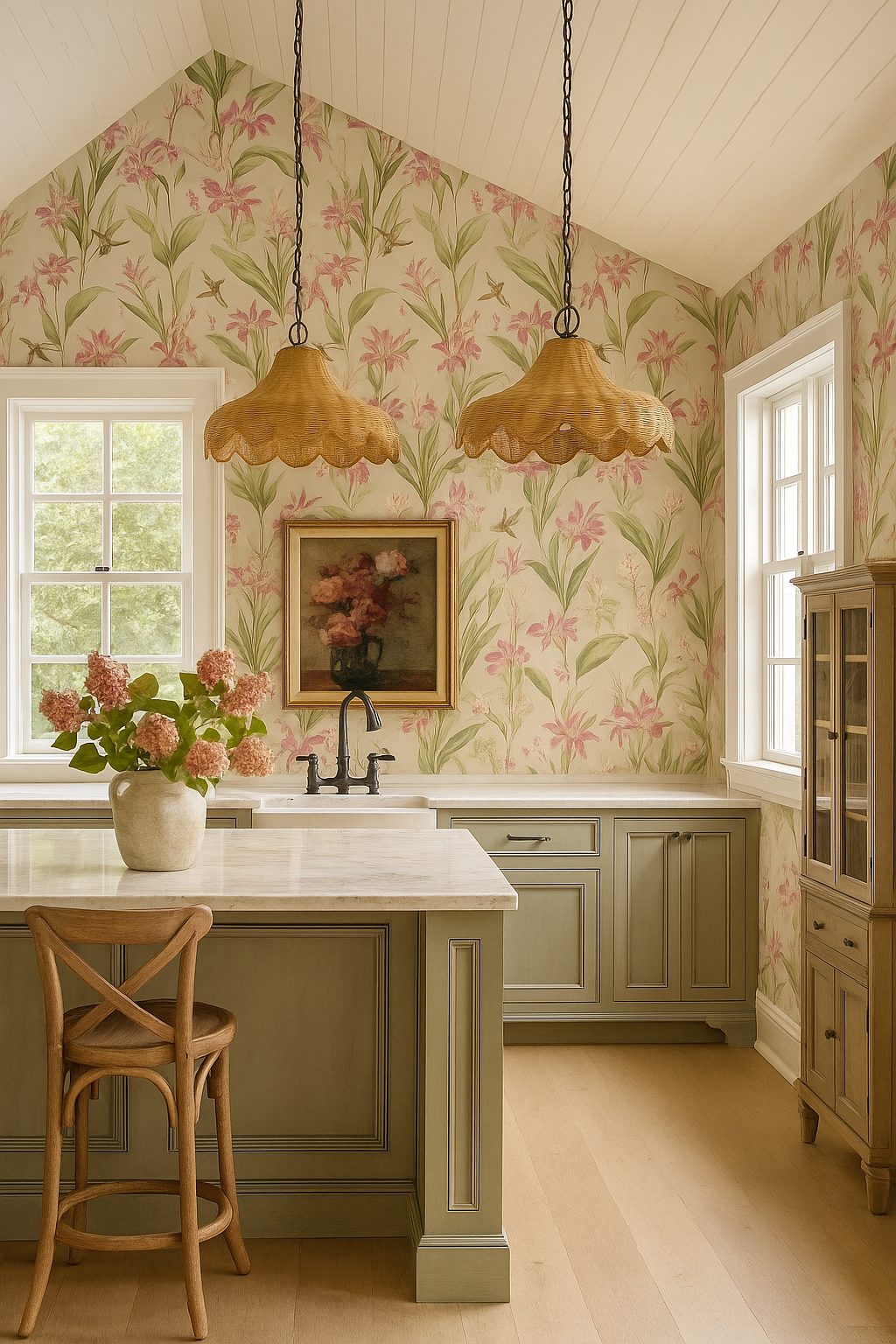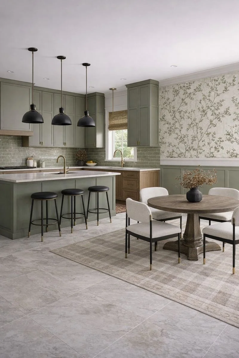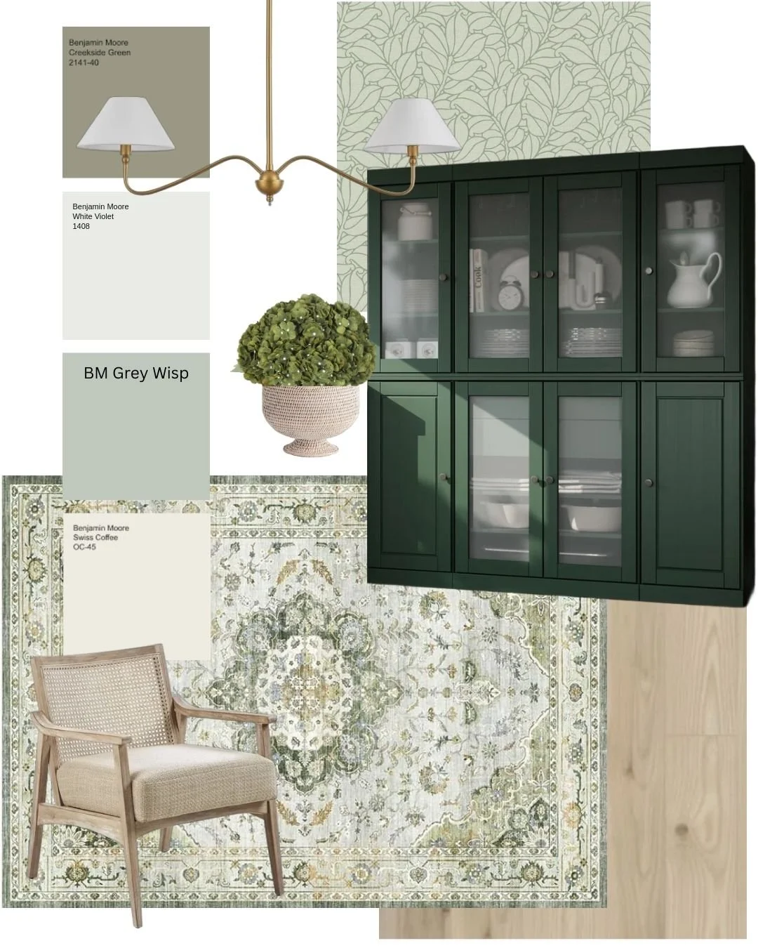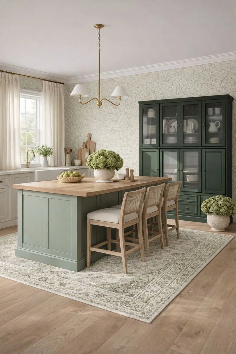 Green kitchens with Honey Oak, Honey Oak Floor colours. Greens with honey oak. Modern green colours. Updating honey oak floors, Benjamin Moore Galapagos Green, Rosemary Sprig, Grey Mirage, Seapearl
